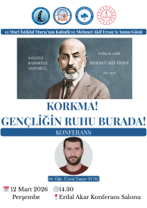 12 Mart 2026 Perşembe günü saat 14.30’da Erdal Akar Konferans Salonunda İstiklal Marşı’nın Kabulü ve Mehmet Akif Ersoy’u Anma Günü etkinlikleri kapsamında Bölümümüz Dr. Öğr. Üyesi Taner Tunç tarafından “Korkma! Gençliğin Ruhu Burada!” temalı konferans verilecektir.